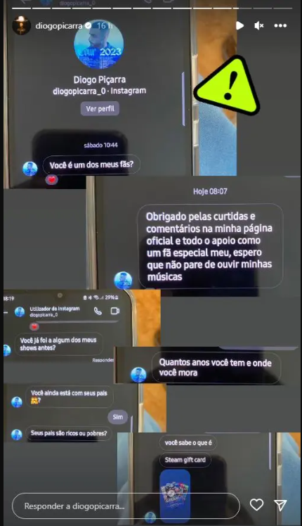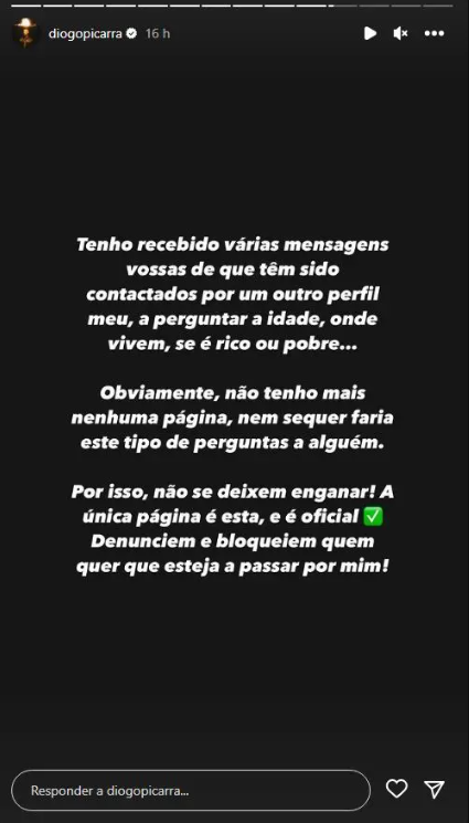 Diogo Piçarra usou sua conta oficial do Instagram para denunciar um crime do qual está sendo alvo na internet. Na terça-feira, 15 de agosto, o cantor compartilhou uma história em que relatava que alguém está se passando por ele nessa rede social.