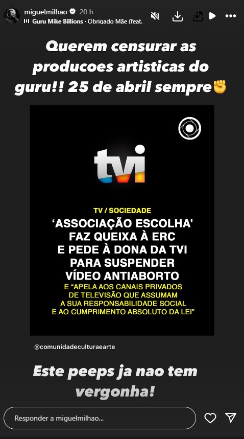 A associação em causa defende a interrupção voluntária da gravidez e considera que a transmissão do vídeo pela TVI “representa incumprimento” e exige que o grupo Media Capital “cesse imediatamente o acordo publicitário firmado com Miguel Milhões (Guru Mike Millions) e que retire do ar qualquer menção ao videoclip“.