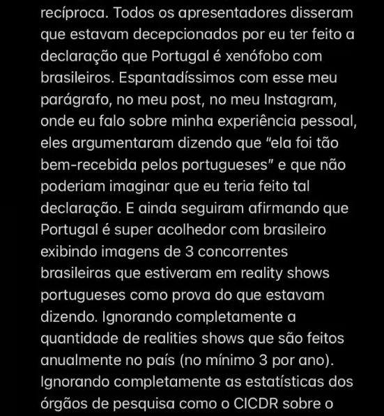 A mesma ainda recordou: “Exibindo imagens de três concorrentes brasileiras que estiveram em reality shows portugueses como prova do que estavam dizendo. Ignorando completamente a quantidade de realities shows que são feitos anualmente no país (no mínimo, três por ano)”.