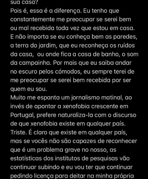 “Muito me espanta um jornalismo matinal, ao invés de apontar a xenofobia crescente em Portugal, prefere naturalizá-la com o discurso de que xenofobia existe em qualquer país. Triste”, lamentou.