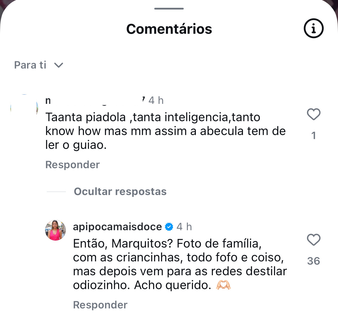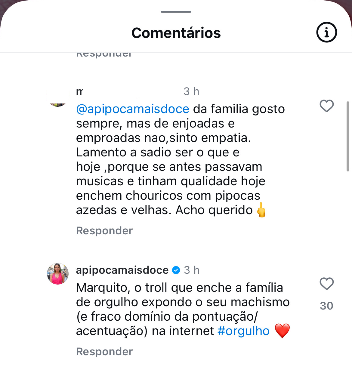 Para finalizar, Ana Garcia Martins não deixou de apontar o machismo no comentário e o erro gramatical, encerrando a discussão de maneira inteligente: “Marquito, o troll que enche a família de orgulho expondo o seu machismo (e fraco domínio da pontuação/acentuação) na internet #orgulho ❤️”.