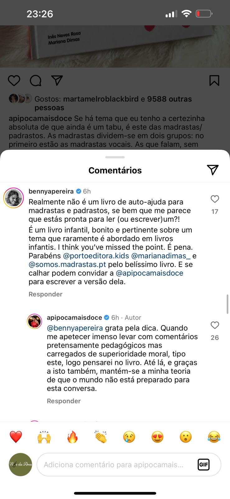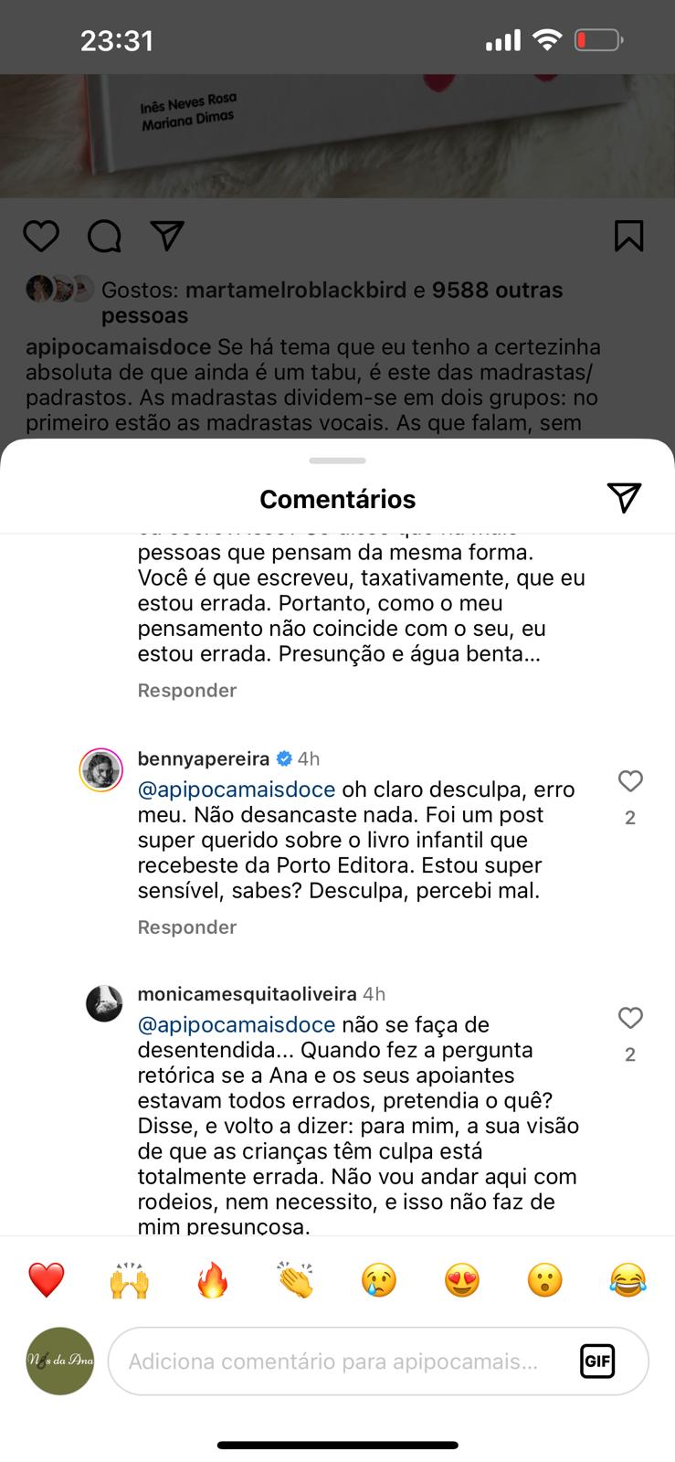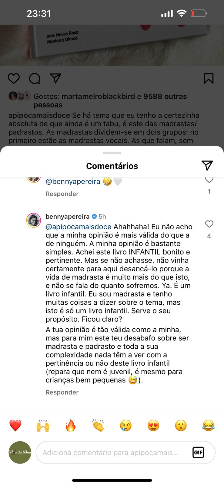 Benedita Pereira discordou deste comentário e rapidamente respondeu à publicação. A atriz considerou que o livro em questão é direcionado para crianças, sendo uma abordagem bonita e pertinente a uma temática raramente explorada em livros infantis. Benedita desafiou ainda A Pipoca Mais Doce a escrever a sua versão sobre o assunto.