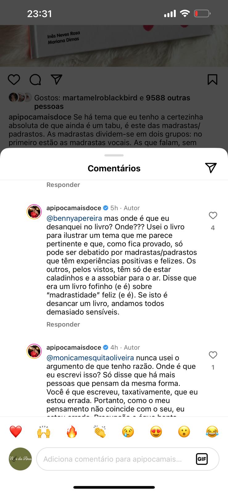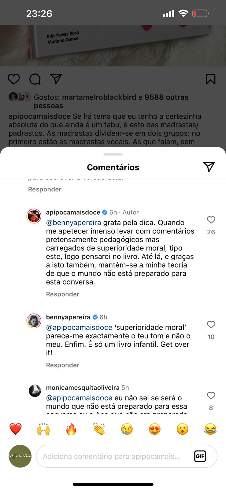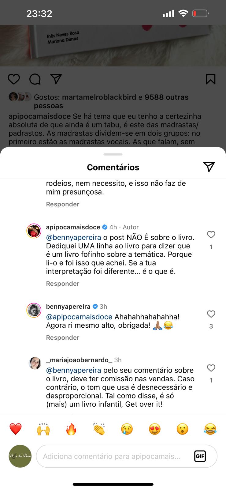 Benedita Pereira discordou deste comentário e rapidamente respondeu à publicação. A atriz considerou que o livro em questão é direcionado para crianças, sendo uma abordagem bonita e pertinente a uma temática raramente explorada em livros infantis. Benedita desafiou ainda A Pipoca Mais Doce a escrever a sua versão sobre o assunto.