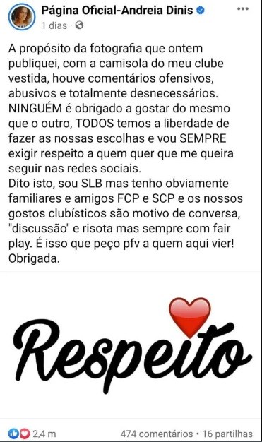 “Dito isto, sou SLB mas tenho obviamente familiares e amigos FCP e SCP e os nossos gostos clubísticos são motivo de conversa, “discussão” e risota mas sempre com fair play. É isso que peço por favor a quem aqui vier! Obrigada“, acrescentou.