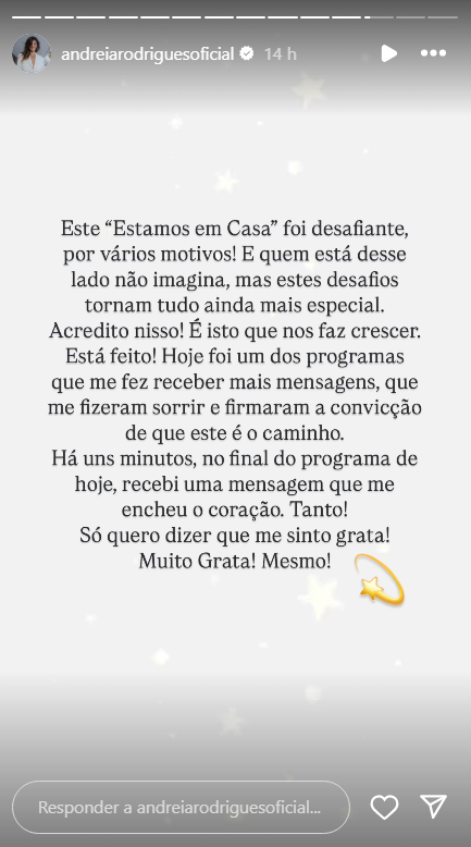 Andreia Rodrigues decidiu partilhar com os seus seguidores que a última emissão de Estamos em Casa foi particularmente difícil. “Foi desafiante, por vários motivos!”, disse, sem revelar exatamente o quê.