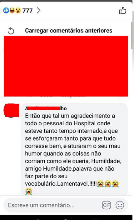«Então que tal um agradecimento a todo o pessoal do Hospital onde esteve tanto tempo internado,e que se esforçaram tanto para que tudo corresse bem, e aturaram o seu mau humor quando as coisas não corriam como ele queria, Humildade, amigo Humildade,palavra que não faz parte do seu vocabulário. Lamentavel.!!!!!», escreveu a enfermeira através das redes sociais.