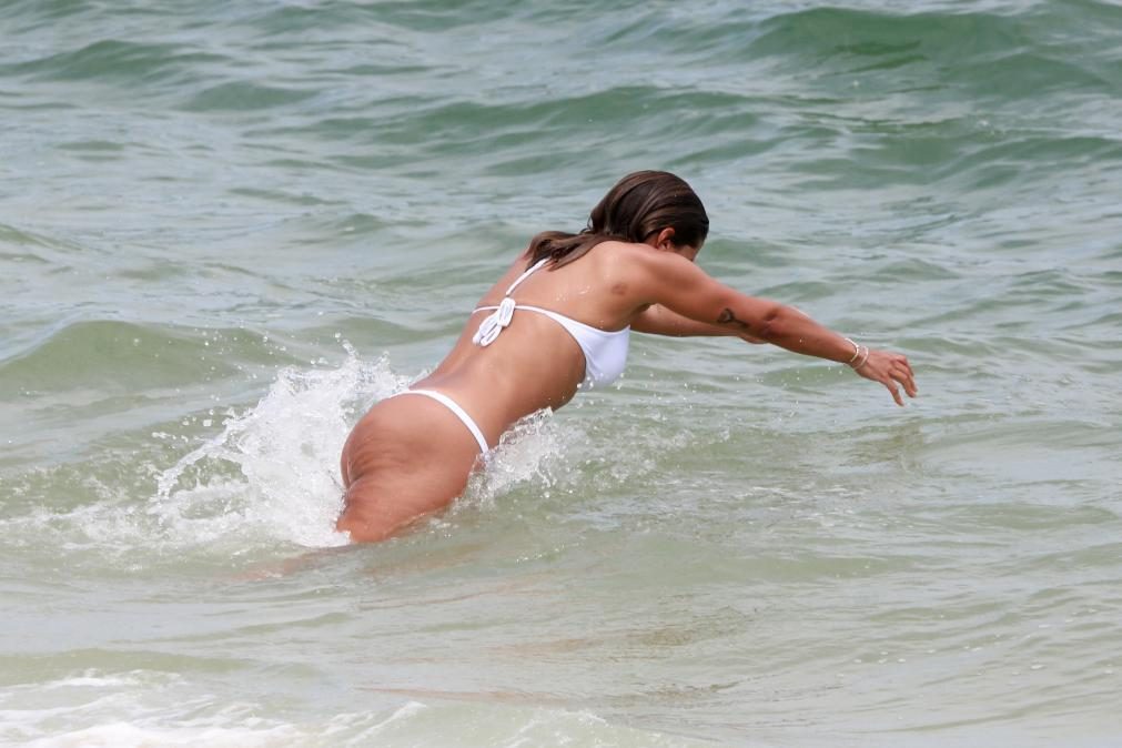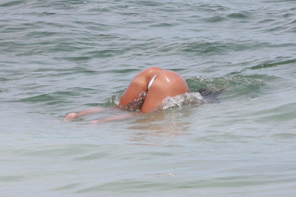 A artista no entanto impressionou com o seu biquíni branco fio dental, mostrando estar em excelente forma física, tanto dentro como fora de água.
