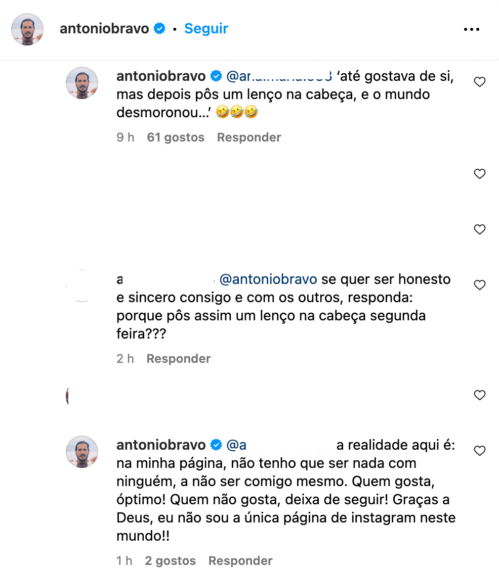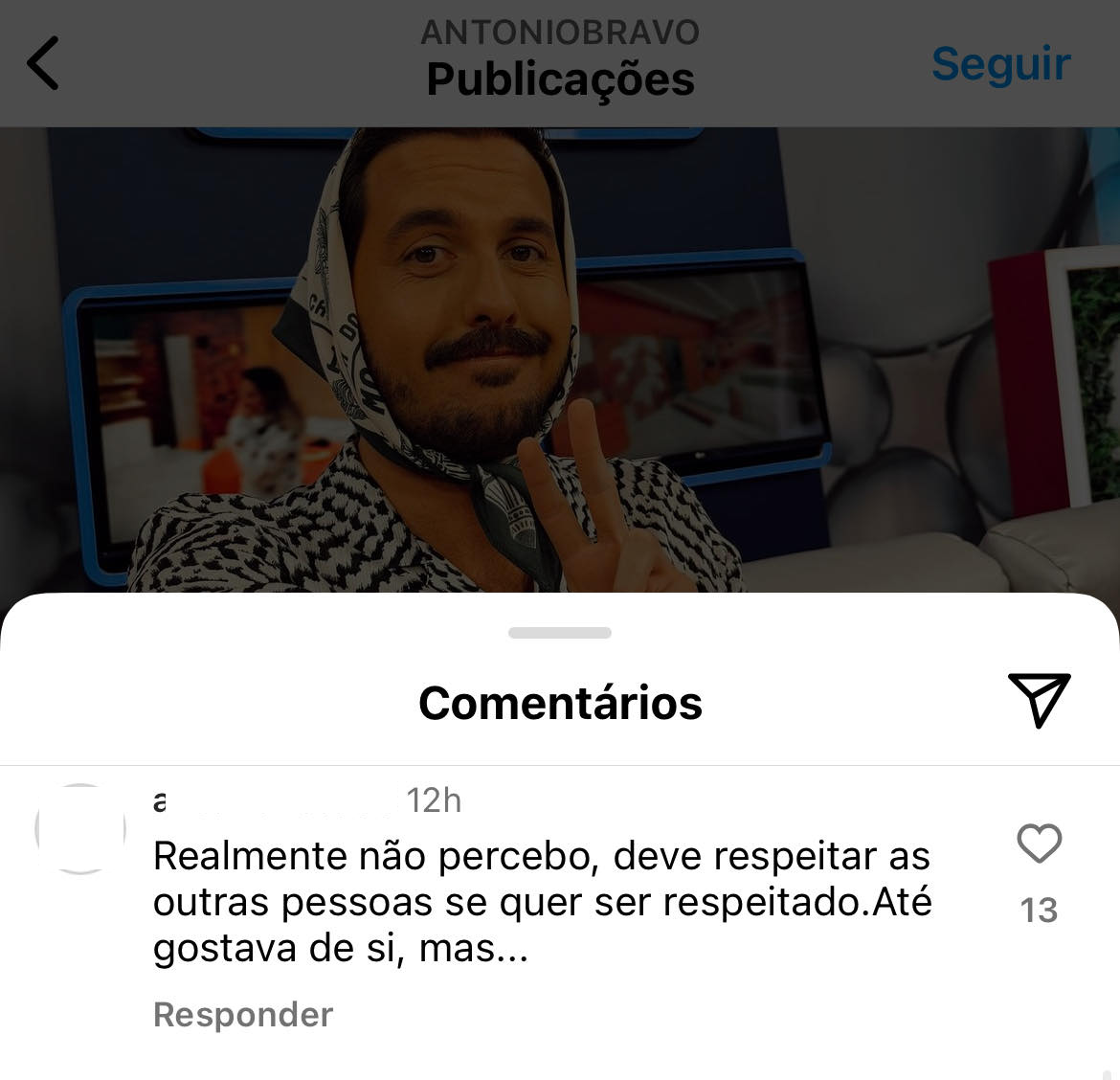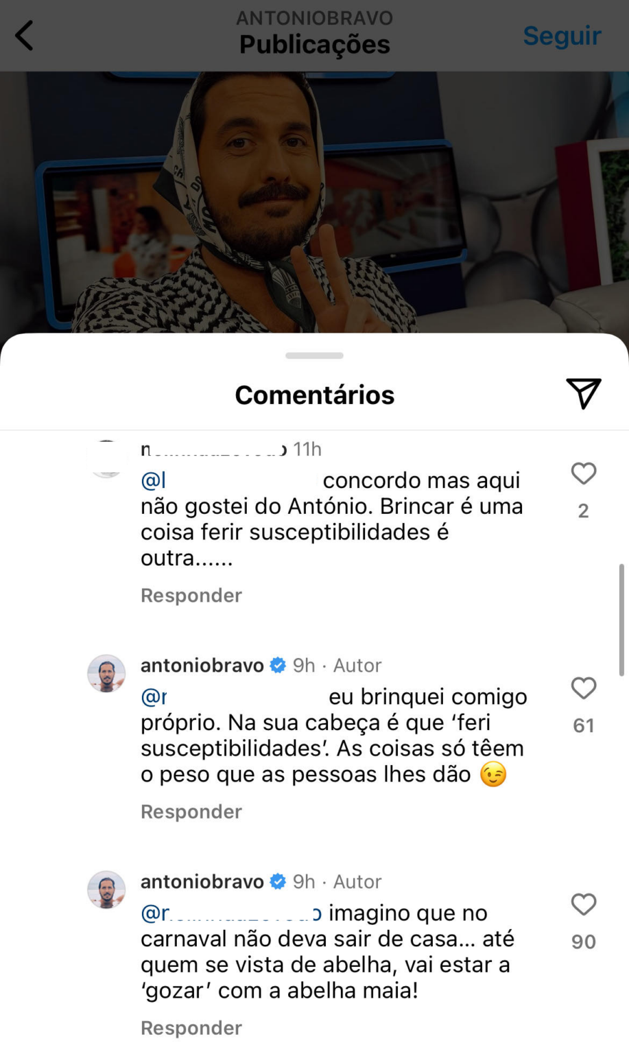 Ao ser confrontado com as críticas, António Bravo respondeu de forma tranquila, afirmando: “Na sua cabeça é que ‘feri susceptibilidades’. As coisas só têm o peso que as pessoas lhes dão”. E ainda acrescentou: “Quem não gosta, deixa de seguir! Graças a Deus, eu não sou a única página de instagram neste mundo!!”.