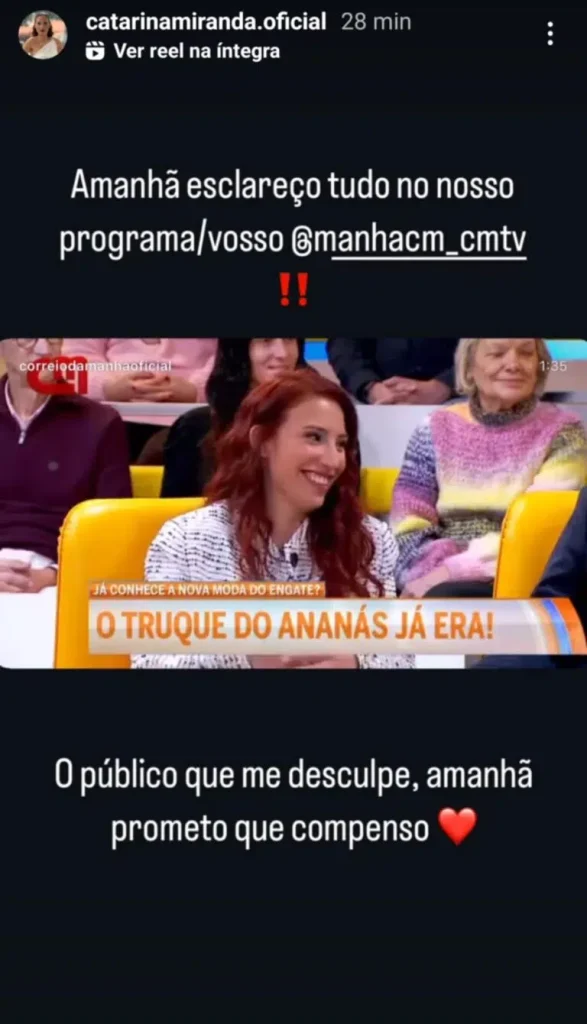 Através das suas redes sociais, Catarina Miranda pronunciou-se: “Amanhã esclareço tudo no nosso/vosso programa Manhã CM. O público que me desculpe, amanhã prometo que compenso”.
