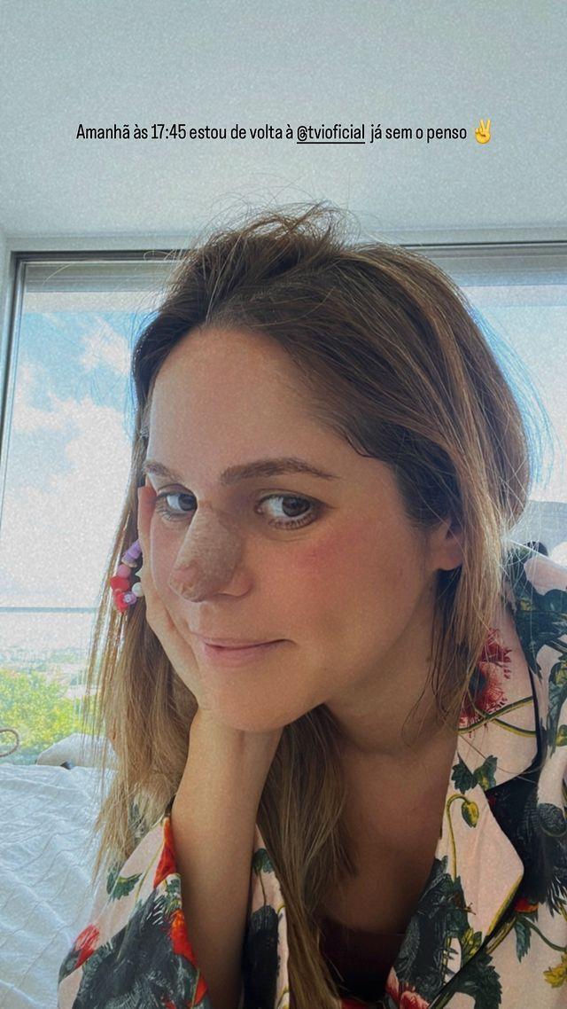 Através do Instagram, a apresentadora televisiva mostrou-se a recuperar da cirurgia ao nariz, partilhando uma novidade: “Amanhã [quarta-feira, dia 22], às 17:45 horas, estou de volta à TVI, já sem o penso”.