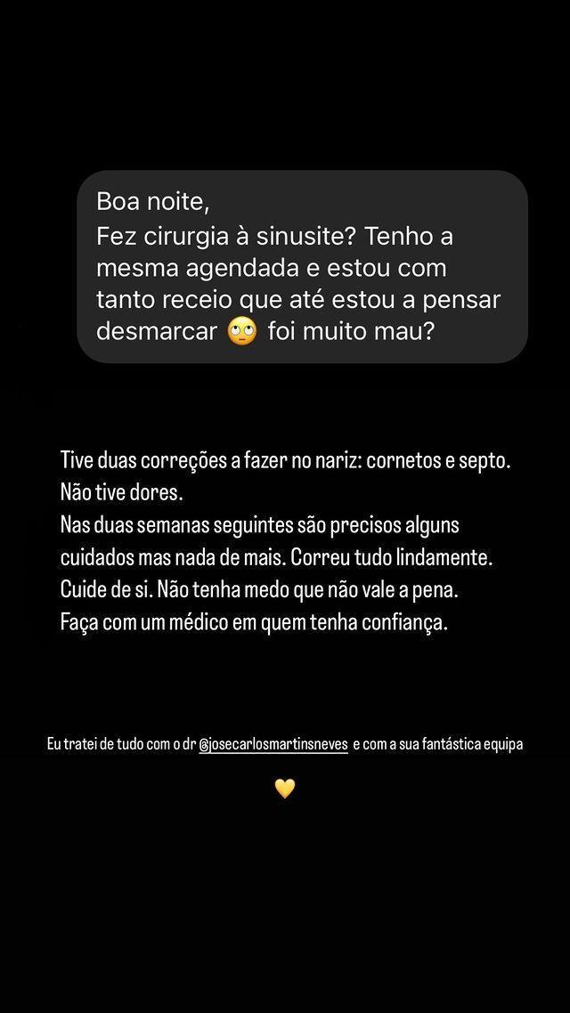 Alice ainda deixou uma esclarecimento a uma pergunta de um seguidor: “Fez cirurgia à sinusite?”. O internauta ainda acrescentou: “Tenho a mesma agendada e estou com tanto receio que até estou a pensar desmarcar. Foi muito mau?”.