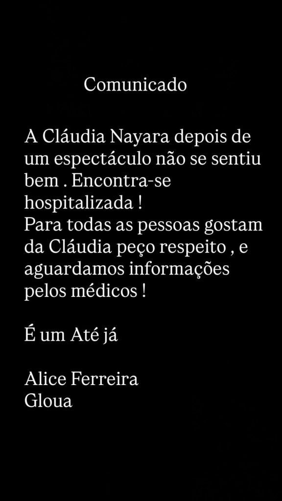 Na mensagem podemos ler: “A Cláudia Nayara, após um espetáculo, não se sentiu bem. Encontra-se hospitalizada!”.