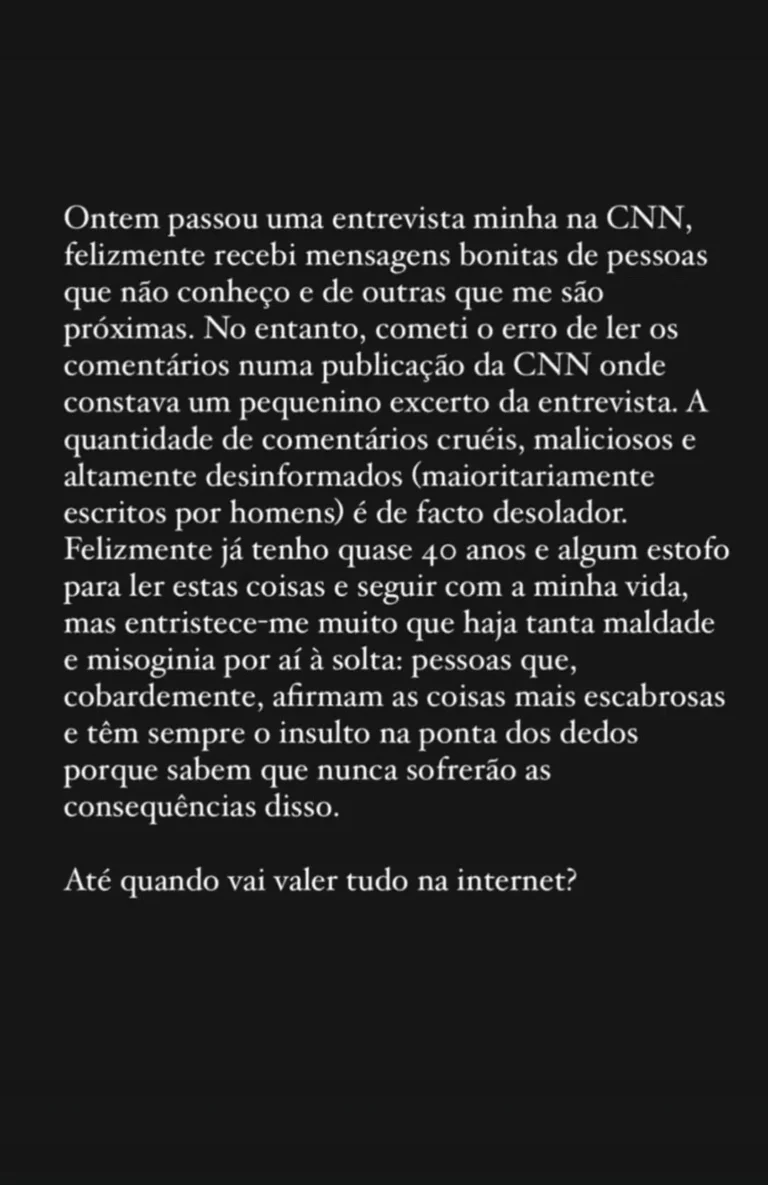 Ainda referiu: “Felizmente, já tenho quase 40 anos e algum estofo para ler estas coisas e seguir com a minha vida, mas entristece-me muito que haja tanta maldade e misoginia por aí à solta: pessoas que, cobardemente, afirmam as coisas mais escabrosas e têm sempre o insulto na ponta dos dedos, porque sabem que nunca sofrerão as consequências disso. Até quando vai valer tudo na internet?“.