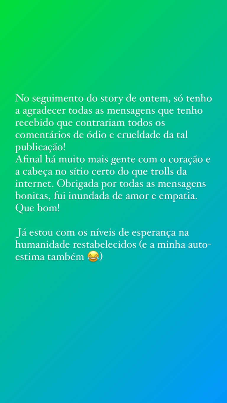 Depois de expor os comentários em questão, a atriz deixou nova mensagem esta segunda-feira: “Só tenho a agradecer todas as mensagens que tenho recebido que contrariam todos os comentários de ódio e crueldade da tal publicação! Afinal, há muito mais gente com o coração e a cabeça no sítio certo do que trolls da Internet. Obrigada por todas as mensagens bonitas. Fui inundada de amor e empatia. Que bom! Já estou com os níveis de esperança na humanidade restabelecidos (e a minha autoestima também)“.