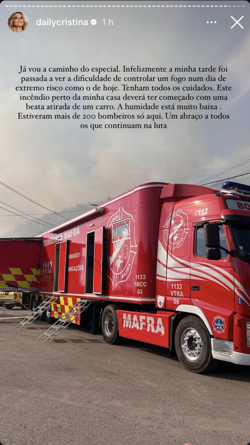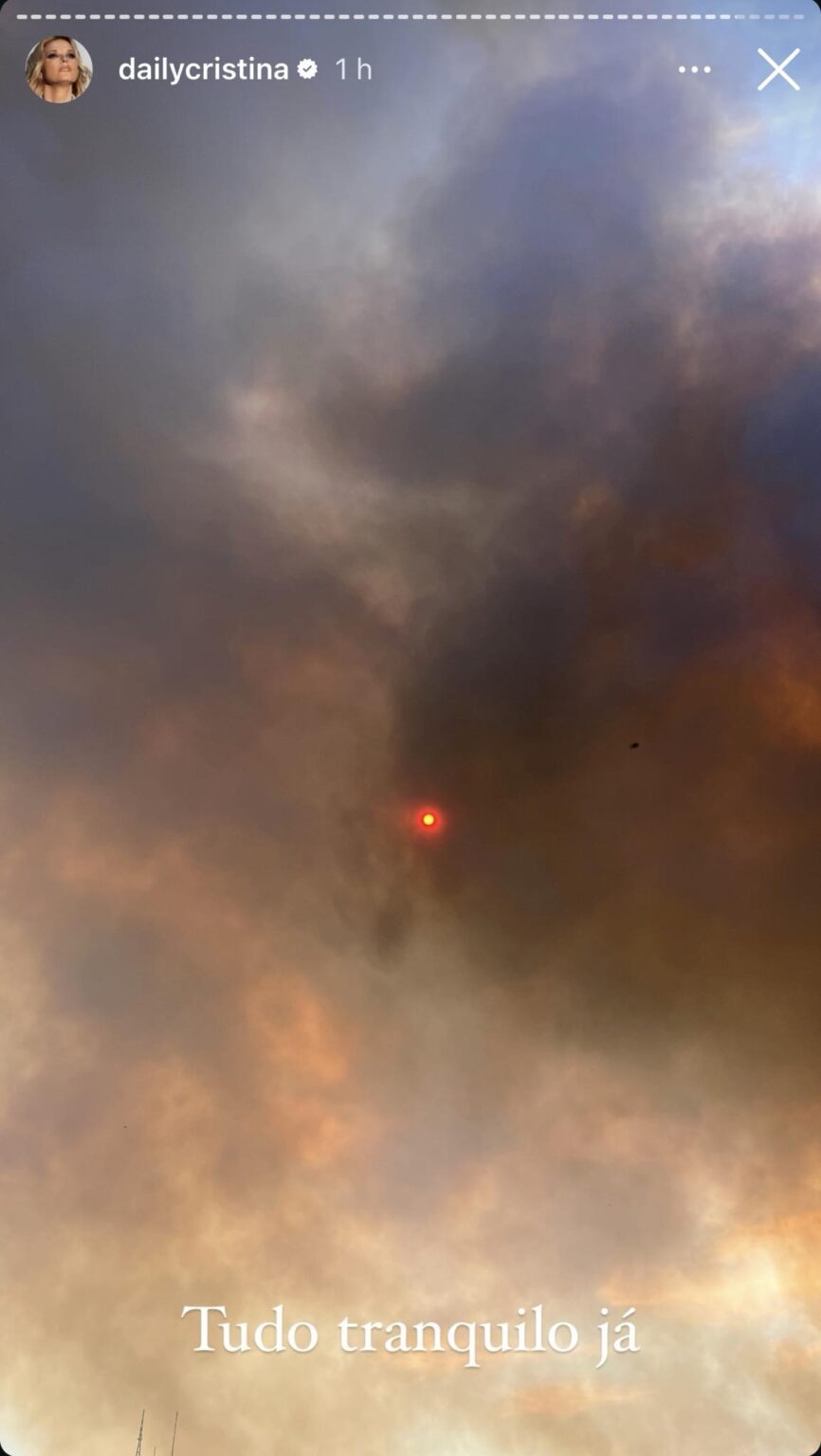 Através das suas redes sociais, Cristina Ferreira reagiu, onde partilhou algumas imagens onde o fogo aconteceu perto da sua casa: “Tudo tranquilo já”.