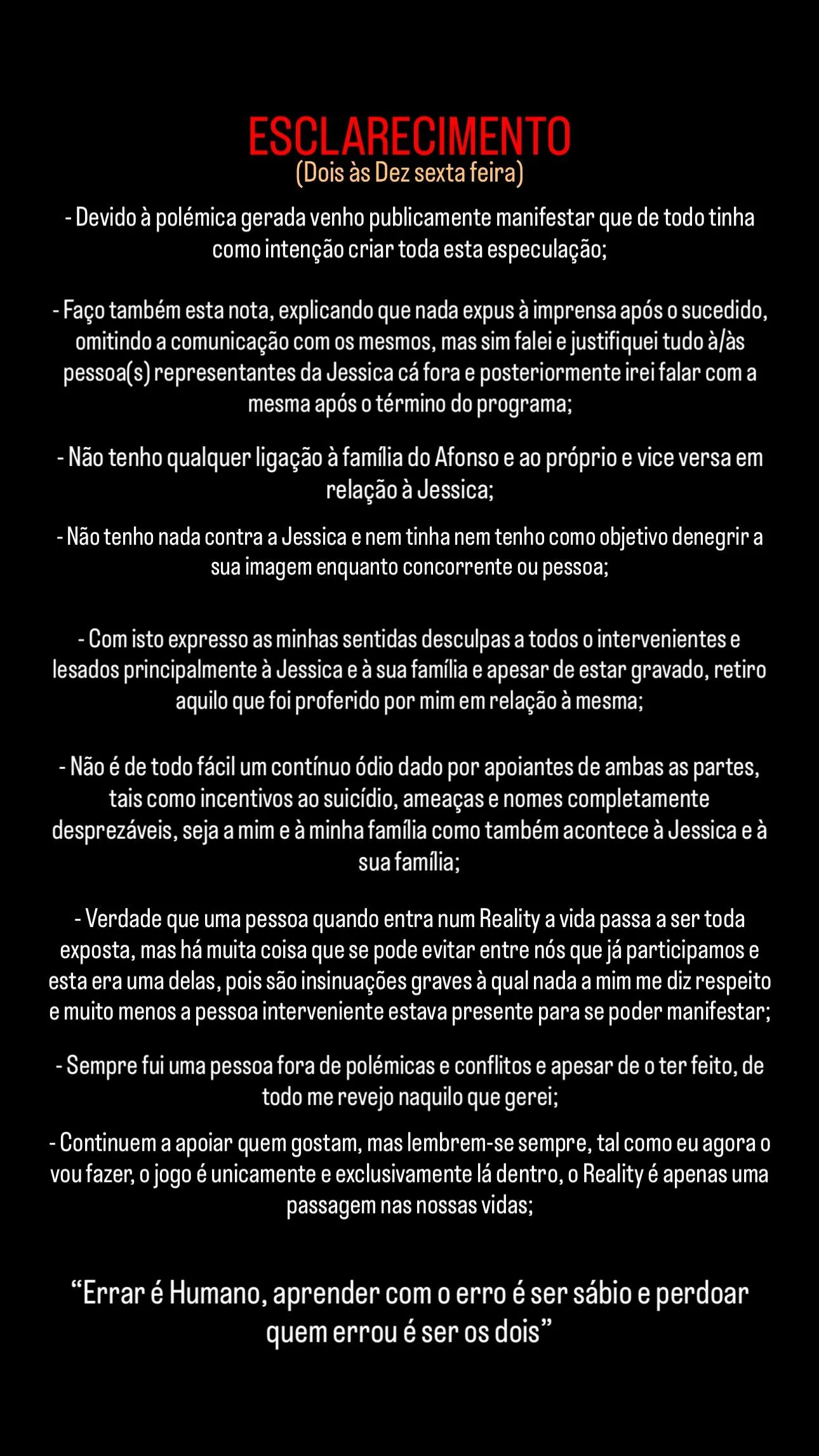 O mesmo começou por escrever: “Devido à polémica gerada venho publicamente manifestar que de todo tinha como intenção criar toda esta especulação. Faço também esta nota, explicando que nada expus à imprensa após o sucedido, omitindo a comunicação com os mesmos, mas sim falei e justifiquei tudo à/às pessoa(s) representantes da Jéssica cá fora e posteriormente irei falar com a mesma após o término do programa“.