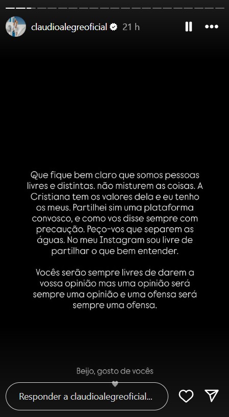 Cláudio Alegre começou por escrever: “Que fique bem claro que somos pessoas livres e distintas, não misturem as coisas. A Cristiana tem os valores dela e eu tenho os meus”.