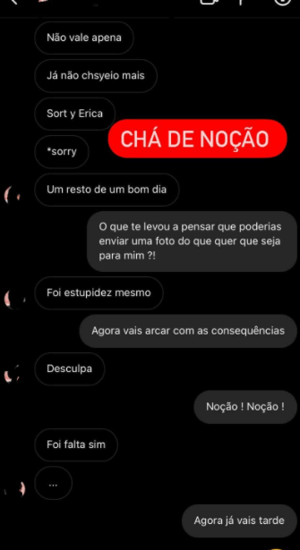 O mesmo acabou por pedir desculpas a Érica que acabou por não perdoar: . “O que te levou a pensar que poderias enviar uma foto do que quer que seja para mim? Noção! Noção! Agora vais arcar com as consequências”.