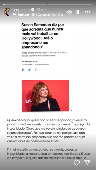 Neste dia 12 de Novembro, através das suas redes sociais, Leonor Poeiras deparou-se com declarações da atriz Susan Sarandon, que afirmou que “nunca mais vai trabalhar em Hollywood” e “aproveitou” para falar da sua situação com a TVI.