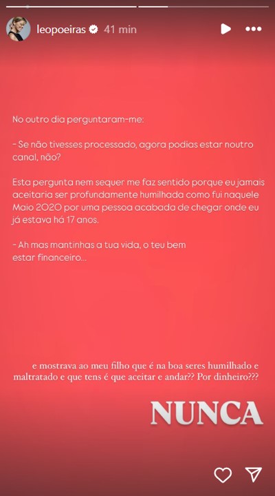 Num Insta Stories ainda continuou: “No outro dia perguntaram-se se não tivesse processado [a TVI], agora podia estar noutro canal. Esta pergunta nem sequer me faz sentido porque eu jamais aceitaria ser profundamente humilhada como fui naquele maio de 2020, por uma pessoa acabada de chegar onde eu já estava há 17 anos”.