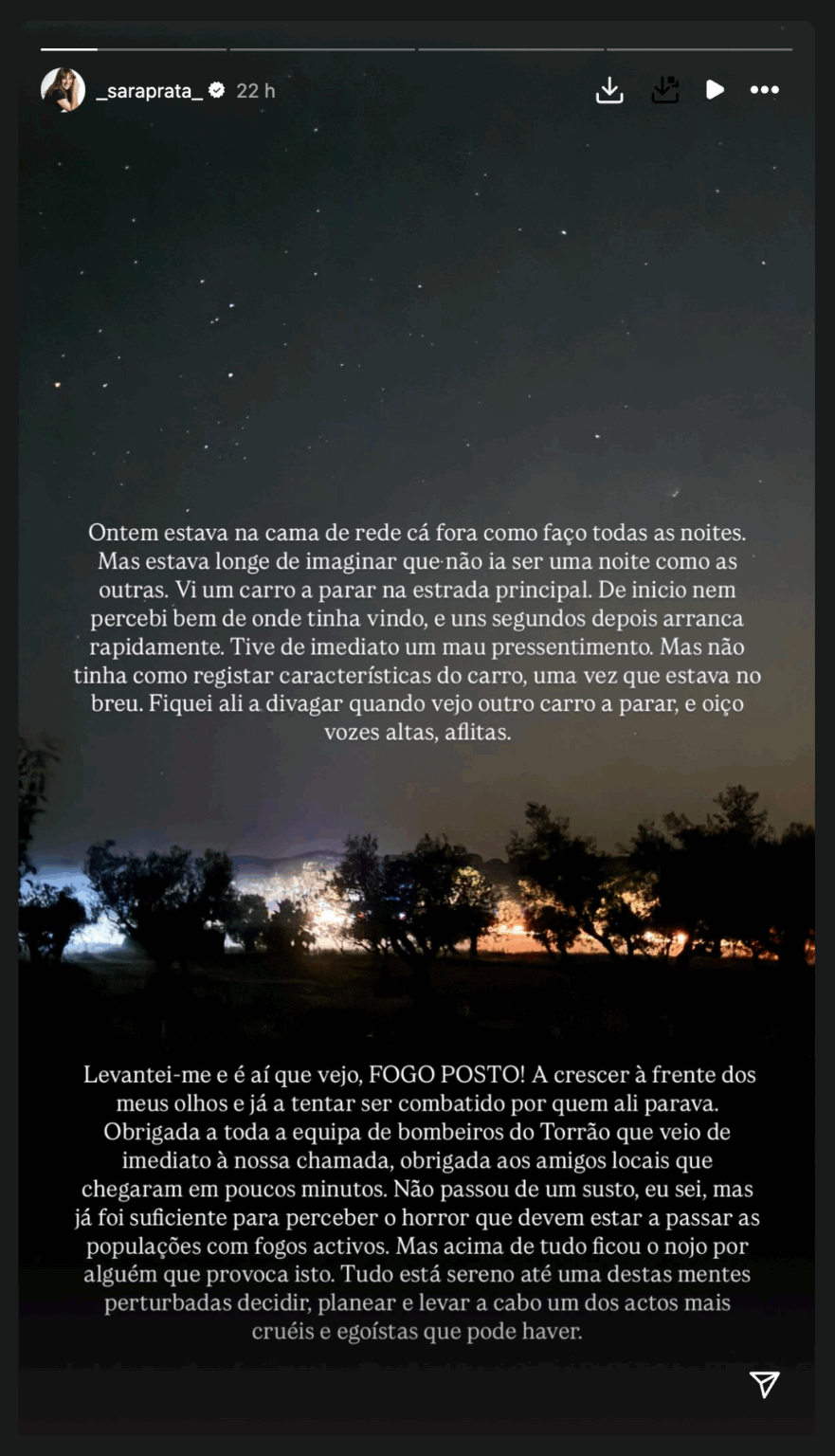 Mais tarde, em vídeo, a atriz deixou um desabafo profundo sobre os incêndios florestais: “(…) O sentimento que fica é este nojo, esta raiva por alguém para o carro, eu vi, eu vi o carro a parar e tive logo um mau pressentimento (…). Pensar em fogo posto, tudo o que se está a passar em Portugal se deve a isto, é fogo posto. São umas mentes loucas que andam conosco no meio da sociedade. (…) Aquele carro parou ali em segundos, fez aquilo e arrancou… Não consigo imaginar outro ato mais cruel, egoísta (…). Ato nojento (…) Foi horrível”, lamentou.