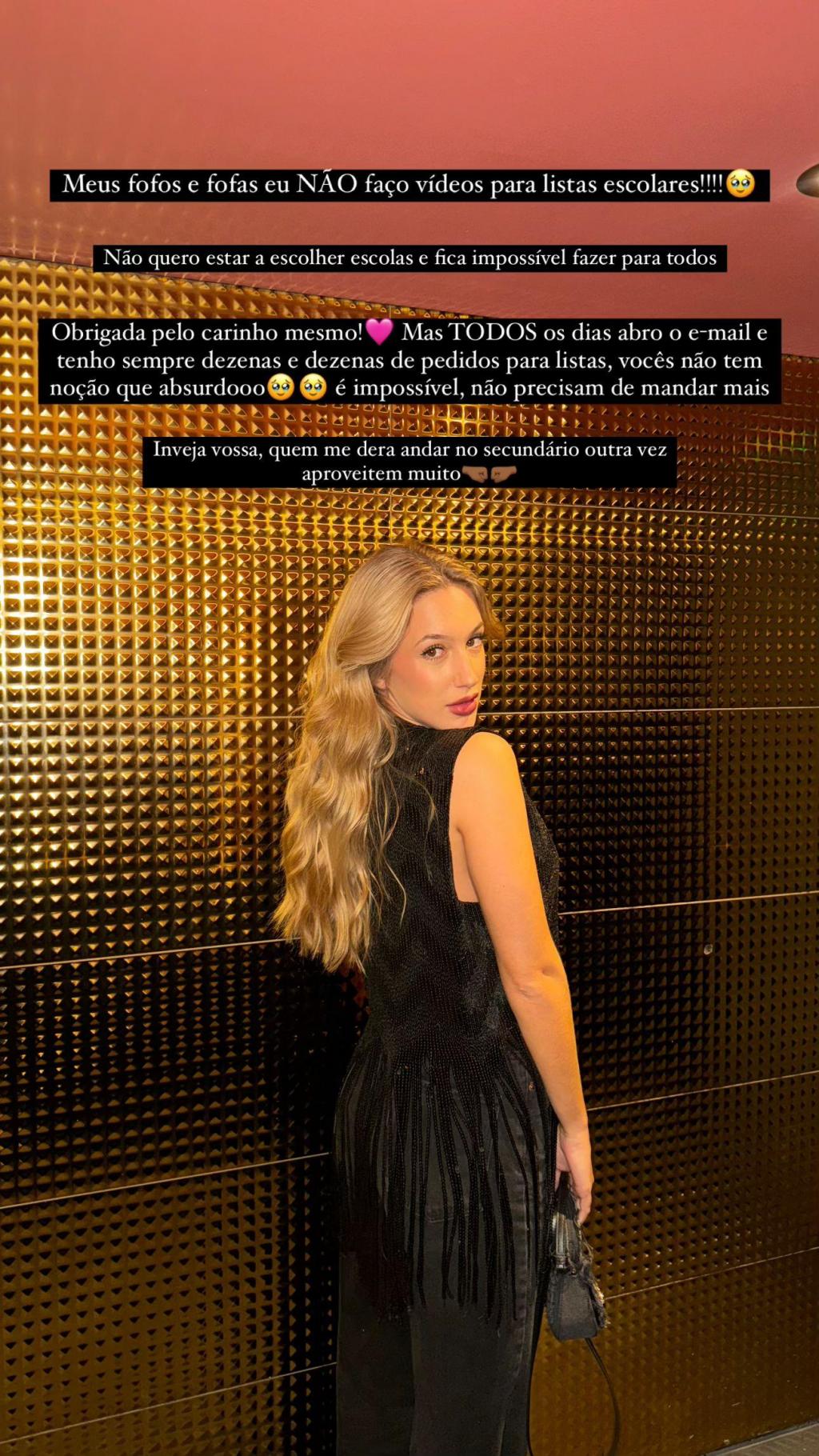 Bárbara Parada fez uma importante declaração no Instagram, afirmando que não estará disponível para vídeos de listas escolares. “Não tenho como satisfazer todos os pedidos, por isso peço desculpa. Prefiro não ter que escolher prioridades”, disse a finalista do “Big Brother – Desafio Final”.