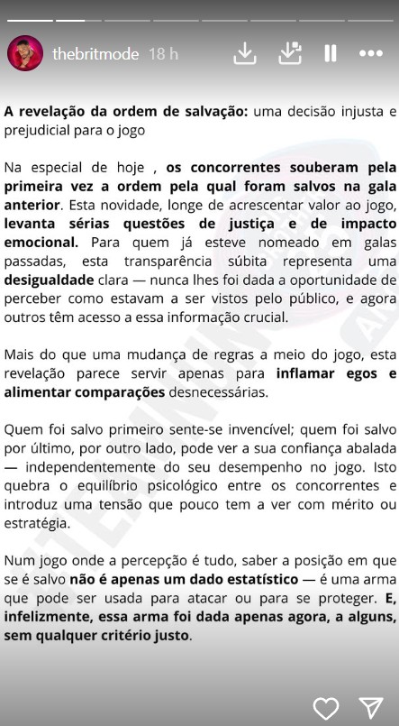 Numa publicação indignada, acusam a produção de alterar as regras a meio do jogo, prejudicando quem já passou por nomeações anteriores sem esse “luxo” da informação. “Esta novidade só veio desequilibrar o jogo e inflamar egos”, escreveram, numa crítica feroz à alegada “injustiça” da decisão.