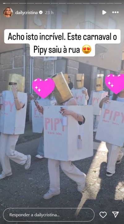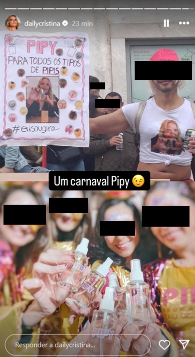 Cristina Ferreira, que parece não se importar com a paródia, reagiu com entusiasmo nas redes sociais. “Acho isto incrível. Este Carnaval o ‘Pipy’ saiu à rua”, escreveu. No dia seguinte, voltou ao tema: “Um Carnaval ‘Pipy’”.
