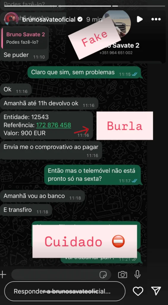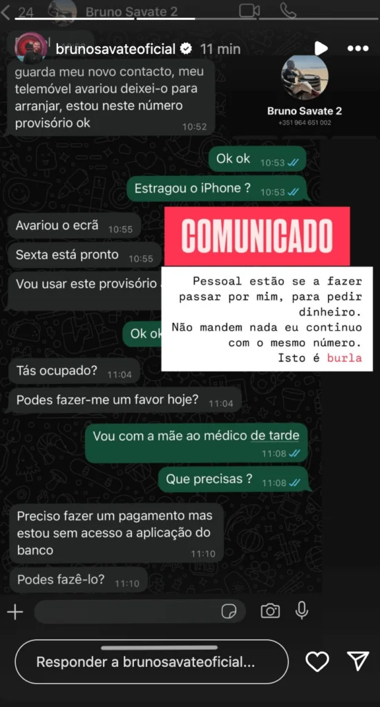 O próprio Bruno partilhou com os seus seguidores algumas das mensagens em que os golpistas tentam extorquir dinheiro em seu nome. “Pessoal, estão-se a fazer passar por mim, para pedir dinheiro. Não mandem nada, eu continuo com o mesmo número. Isto é burla”, foi o aviso deixado pelo ex-concorrente.