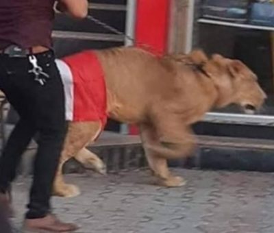 Um jovem iraquiano decidiu levar o seu leão coberto por uma bandeira do Iraque para protesto após saber que polícia ia levar cães. O leão ainda que