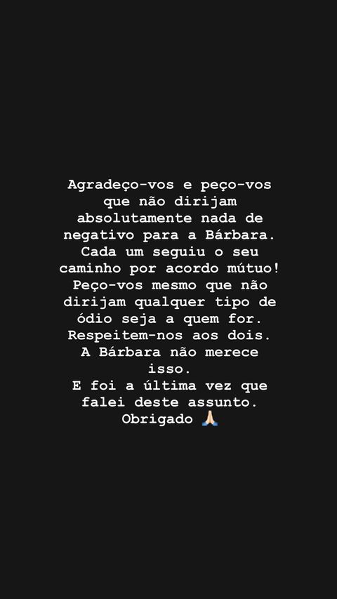 “Cada um seguiu o seu caminho por acordo mútuo! Peço-vos mesmo que não dirijam qualquer tipo de ódio seja a quem for. Respeitem-nos aos dois. A Bárbara não merece isso”, partilhou Francisco.