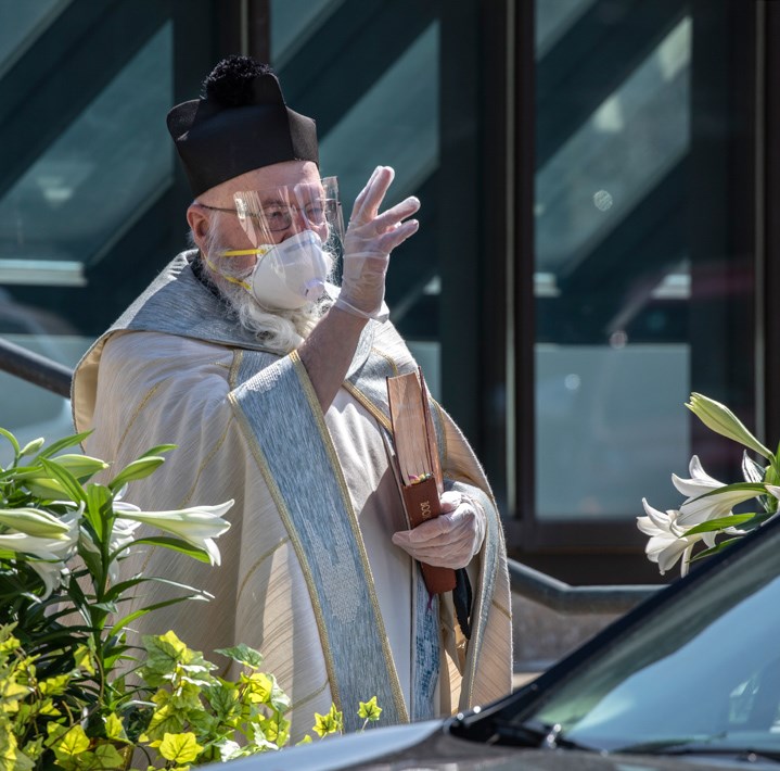 As imagens do padra Timothy Pelc tornaram-se virais, nas redes sociais, após encontrar uma forma de estar em contacto com as pessoas, para as abençoar com água benta.