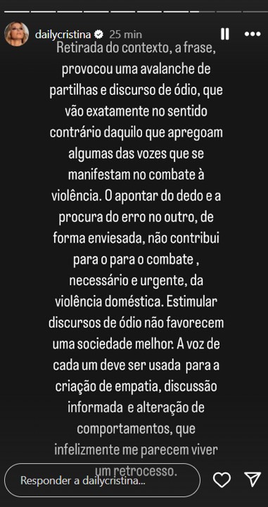 Acrescentou ainda: “Retirada do contexto, a frase, provocou uma avalanche de partilhas e discurso de ódio, que vão exatamente no sentido contrário daquilo que apregoam algumas das vozes que se manifestam no combate à violência. O apontar do dedo e a procura do erro no outro, de forma enviesada, não contribui para o para o combate, necessário e urgente, da violência doméstica. Estimular discursos de ódio não favorecem uma sociedade melhor. A voz de cada um deve ser usada para a criação de empatia, discussão informada e alteração de comportamentos, que infelizmente me parecem viver um retrocesso”.