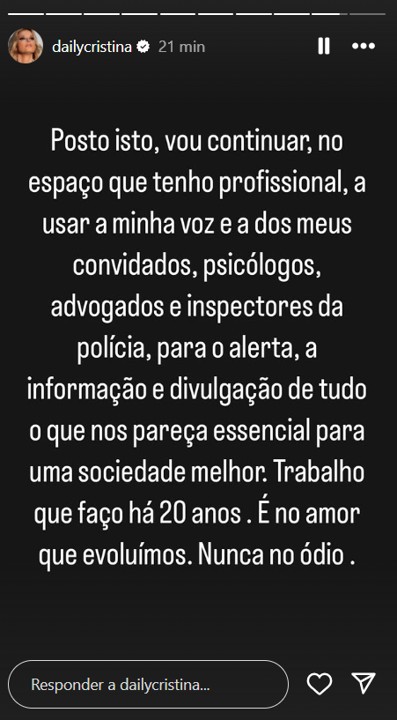 “Posto isto, vou continuar, no espaço que tenho profissional, a usar a minha voz e a dos meus convidados, psicólogos, advogados e inspetores da polícia, para o alerta, a informação e divulgação de tudo o que nos pareça essencial para uma sociedade melhor. Trabalho que faço há 20 anos. É no amor que evoluímos. Nunca no ódio”, rematou.