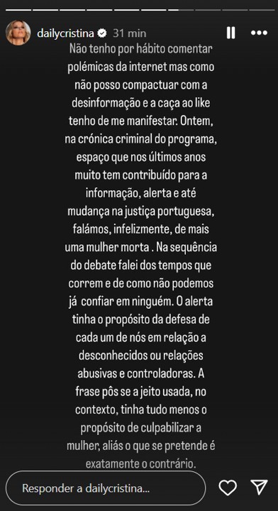 “Não tenho por hábito comentar polémicas da internet, mas como não posso compactuar com a desinformação e a caça ao like tenho de me manifestar. Ontem, na crónica criminal do programa, espaço que nos últimos anos muito tem contribuído para a informação, alerta e até mudança na justiça portuguesa, falámos, infelizmente, de mais uma mulher morta. Na sequência do debate falei dos tempos que correm e de como não podemos já confiar em ninguém. O alerta tinha o propósito da defesa de cada um de nós em relação a desconhecidos ou relações abusivas e controladoras. A frase pôs-se a jeito usada, no contexto, tinha tudo menos o propósito de culpabilizar a mulher, aliás o que se pretende é exatamente o contrário”, começa por escrever.