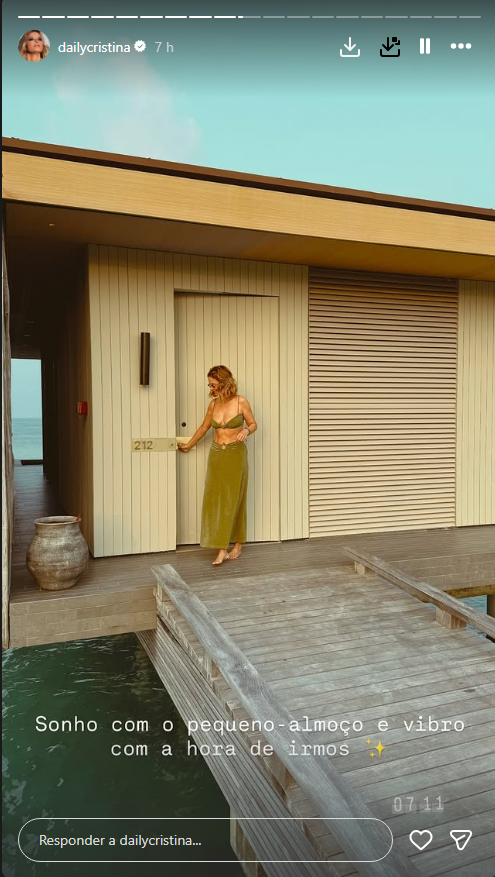 Cristina revelou estar a saborear cada momento passado na ilha, desde os pequenos-almoços que descreve como verdadeiros sonhos até aos instantes de lazer partilhados a dois. Mesmo em férias, o casal mantém a filosofia “No days off”, conciliando atividade com tempo de qualidade juntos.