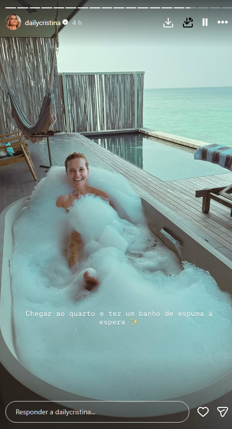 Instalada numa villa de luxo, a apresentadora tem sido surpreendida com vários mimos, incluindo um banho de espuma preparado à sua espera, um detalhe que ajudou a tornar a experiência ainda mais especial.