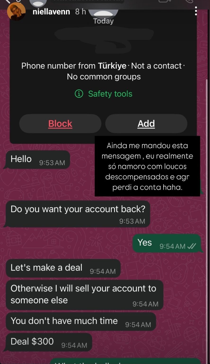 Daniela é surpreendida com uma proposta: “Vamos fazer um acordo. Caso contrário, eu venderei a tua conta a outra pessoa. Não tens muito tempo. Oferta de 300 dólares“.