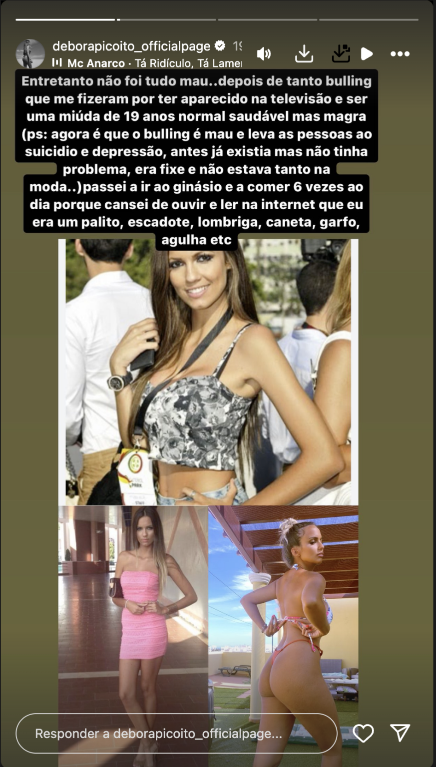 A mesma ainda disse: “Entretanto não foi tudo mau… depois de tanto bullying que me fizeram por ter aparecido na televisão e ser uma miúda de 19 anos normal, saudável mas magra (…) passei a ir ao ginásio e a comer 6 vezes ao dia porque me cansei de ouvir e ler na internet que eu era um palito, escadote, lombriga, caneta, garfo, agulha”.
