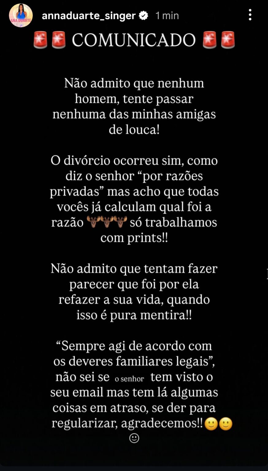 Para desmentir o comunicado feito pelo mesmo, a equipa de Ana Duarte recorreu às redes sociais da cantora onde podemos ler: Não admito que nenhum homem tente passar nenhuma das minhas amigas de louca! O divórcio ocorreu sim, como diz o senhor, “por razões privadas”, mas acho que todas vocês já calculam qual foi a razão. Só trabalhamos com prints. Não admito que tentem fazer parecer que foi por ela refazer a sua vida, quando isso é pura mentira“.