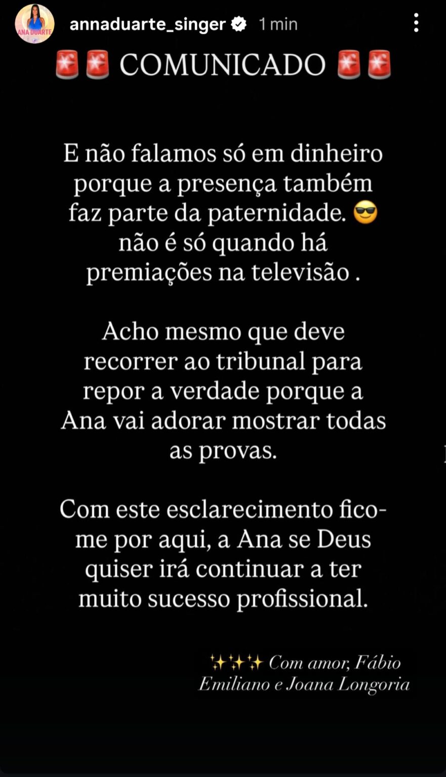 “E não falamos só em dinheiro, porque a presença também faz parte da paternidade. Não é só quando há premiações na televisão. Acho mesmo que deve recorrer ao tribunal para repor a verdade, porque a Ana vai adorar mostrar todas as provas. Com este esclarecimento fico-me por aqui, a Ana, se Deus quiser, irá continuar a ter muito sucesso profissional“, remataram.