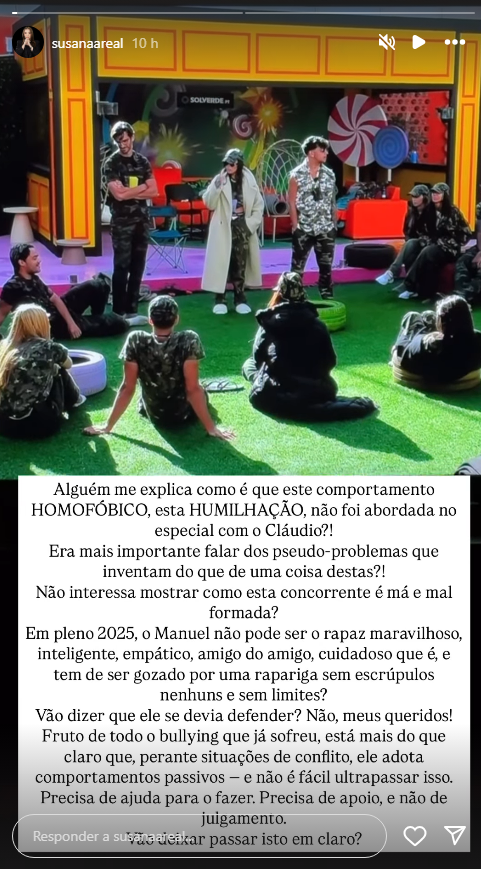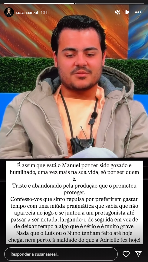Num tom visivelmente revoltado, Susana Areal lamentou a forma como Manuel tem sido tratado, afirmando que o concorrente demonstra ser “um rapaz maravilhoso, inteligente, empático, leal e cuidadoso” — mas que acaba constantemente ridicularizado por alguém que, na sua opinião, “não tem limites nem escrúpulos”.