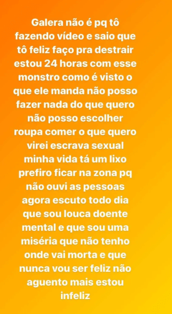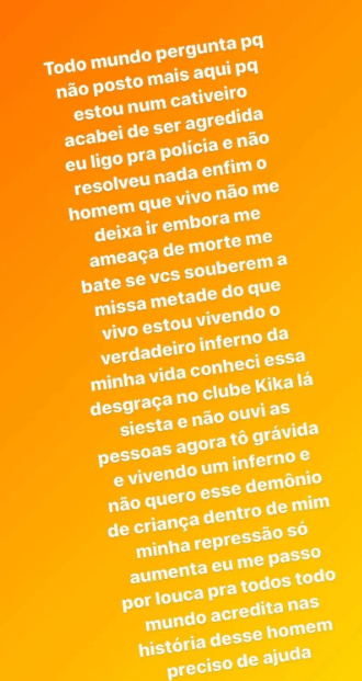 “Todo mundo pergunta porque não posto mais aqui porque estou num cativeiro, acabei de ser agredida, eu ligo pra polícia e não resolveu nada. Enfim, o homem que vivo não me deixa ir embora, me ameaça de morte, me bate. Se vocês souberem a missa metade do que vivo…”, começa por escrever.