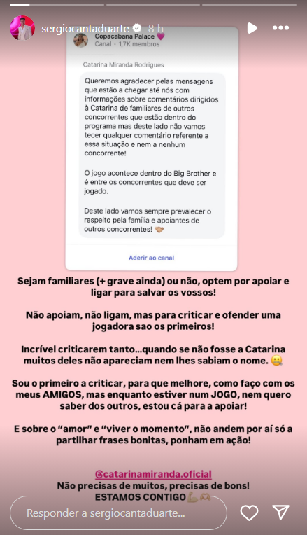 Mais do que defender a amiga, Sérgio apelou ao bom senso e à coerência de quem critica: “Incrível criticarem tanto… quando se não fosse a Catarina muitos deles não apareciam nem lhes sabiam o nome.”