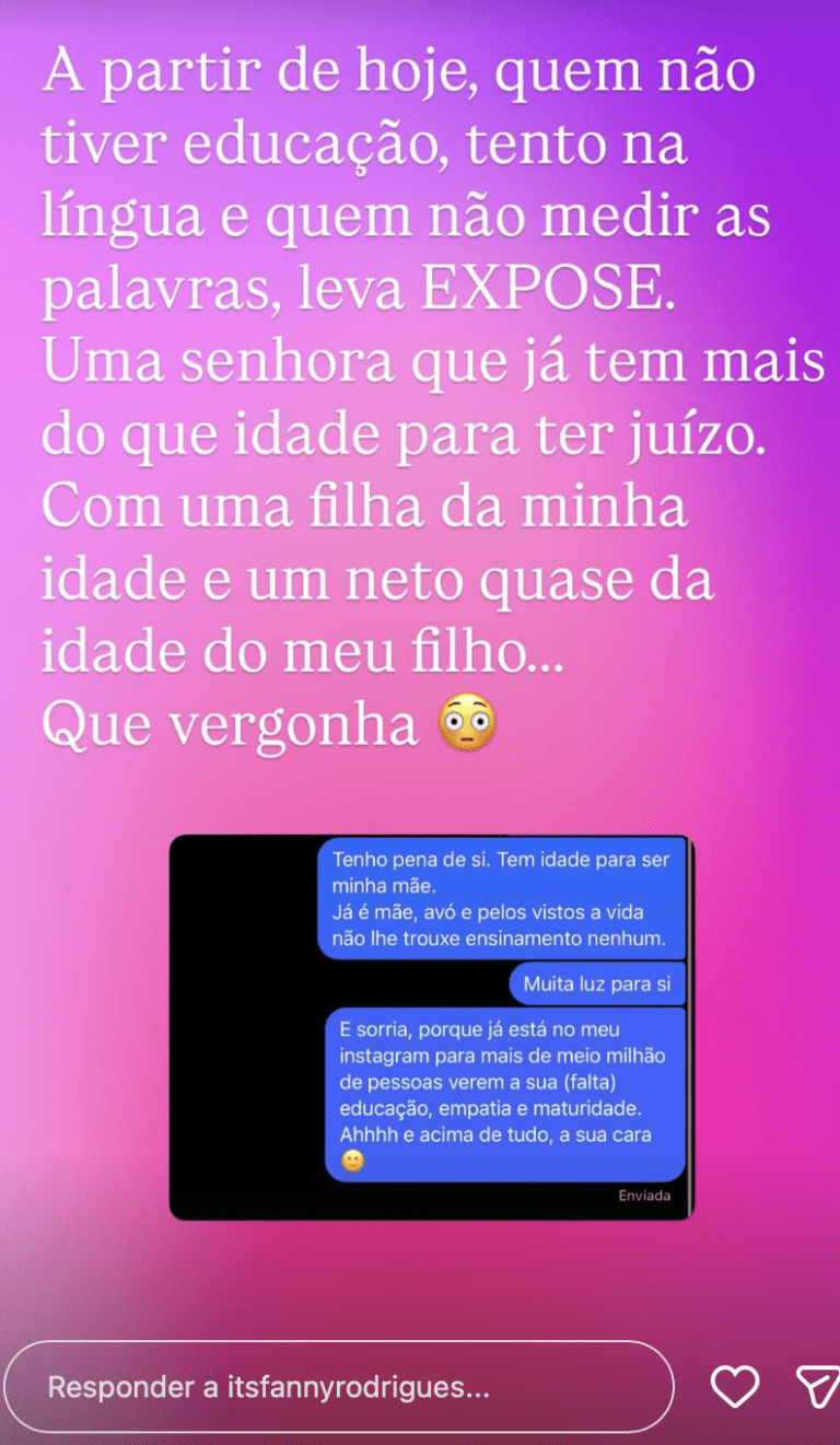 Visivelmente abalada, mas determinada, Fanny Rodrigues respondeu de forma firme, deixando um aviso claro a quem insiste em ultrapassar os limites. “Quem não tiver educação e não medir as palavras, leva EXPOSE”, escreveu, reforçando que a crítica pode existir, mas nunca quando atinge a dignidade pessoal ou envolve uma criança.