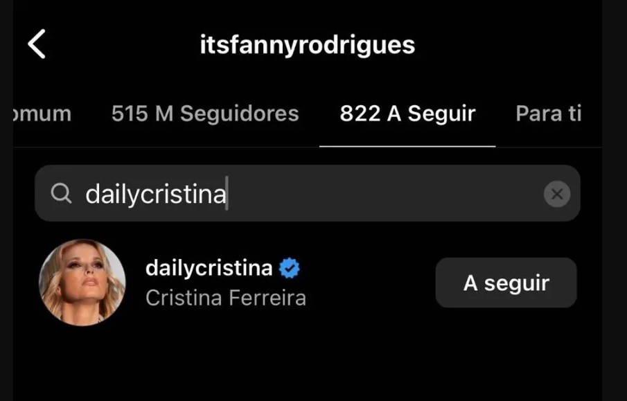 Ainda assim, após reagir à “polémica”, Fanny Rodrigues recuou na sua decisão e voltou a seguir Cristina Ferreira nas redes sociais.
