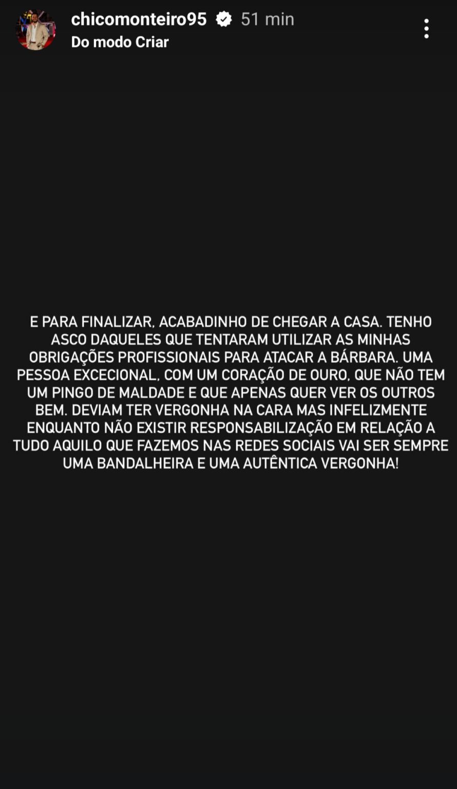 Desta vez, o comentador acabou por deixar uma mensagem no Insta Stories, visto que atacaram Bárbara Parada, em virtude do reencontro com Márcia Soares: “Tenho asco daquele que tentaram utilizar as minhas obrigações profissionais para atacar a Bárbara. Uma pessoa excecional, com um coração de ouro, que não tem um pingo de maldade e que apenas quer ver os outros bem“.