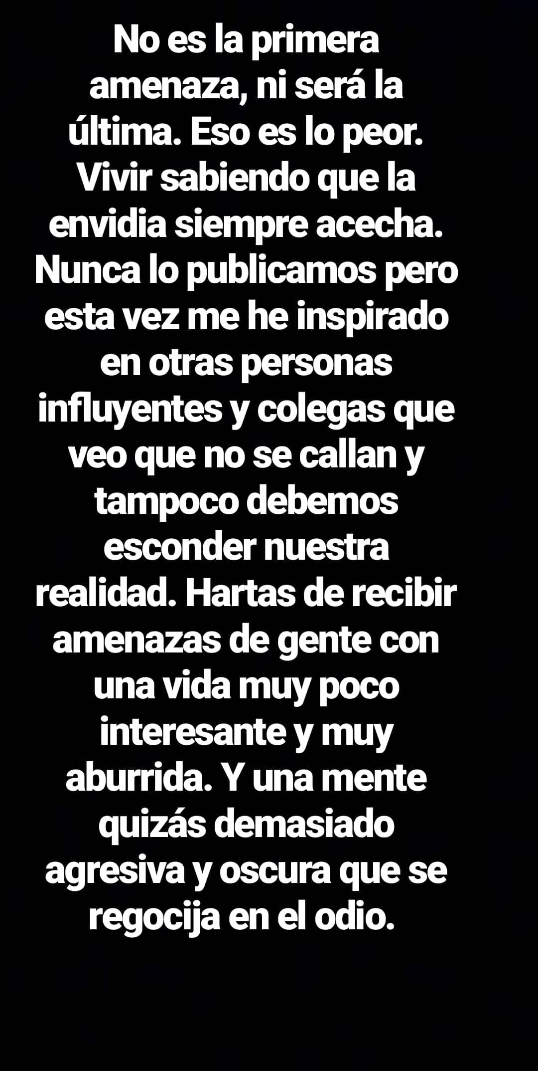 “Não é a primeira ameaça nem será a última. Isso é o pior, viver sabendo que a inveja sempre espreita. Nunca divulgamos, mas desta vez inspirei-me em outras pessoas influentes e em amigos que vejo que não se calam. Nem devemos esconder a nossa realidade. Estou farta de receber ameaças de pessoas com uma vida muito pouco interessante e aborrecida”, rematou.