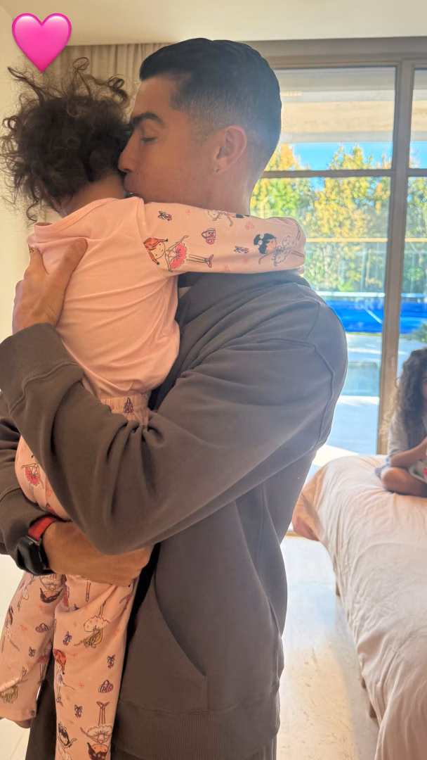 Um dos momentos mais ternurentos das partilhas mostra Cristiano Ronaldo com Bella Esmeralda ao colo, num gesto de carinho que espelha o lado mais familiar do jogador português.
