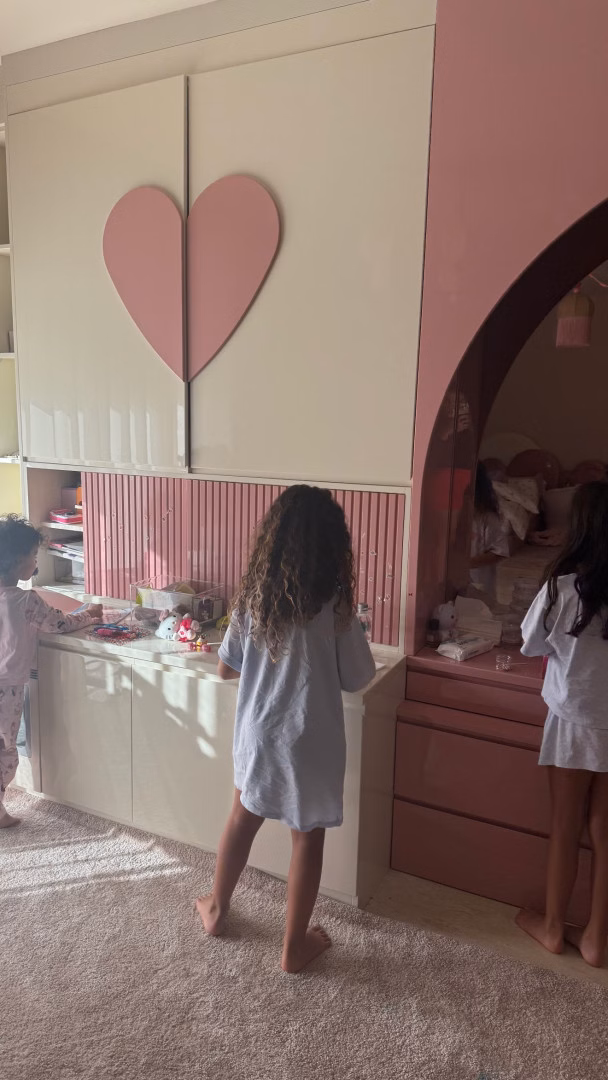 Outro dos espaços que Georgina revelou foi o quarto das filhas Eva, Alana Martina e Bella Esmeralda. As três aparecem a brincar num ambiente amoroso, decorado com detalhes em forma de coração, cores suaves e mobiliário personalizado ao gosto das meninas.